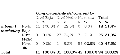 El Inbound Marketing se relaciona significativamente en el comportamiento del consumidor de las empresas de la Feria Emprendedora Mall Aventura en Chiclayo según los resultados que se muestran en la tabla 3.