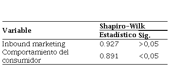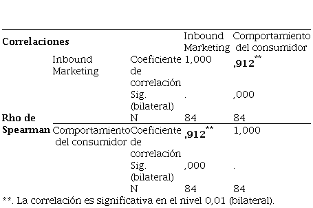 En la tabla 4 se presentan los resultados de la correlación entre las variables Inbound Marketing y comportamiento del consumidor, encontrándose entre ambas variables una correlacionó positiva muy fuertemente, ya que el coeficiente de Rho de Spearman fue de . = 0,912, siendo este hallazgo estadísticamente significativo (<0,05). En consecuencia, se rechaza la hipótesis nula, comprobando la hipótesis general del estudio, en donde se establece que el Inbound Marketing se relaciona significativamente en el comportamiento del consumidor de las empresas de la Feria Emprendedora Mall Aventura en Chiclayo.