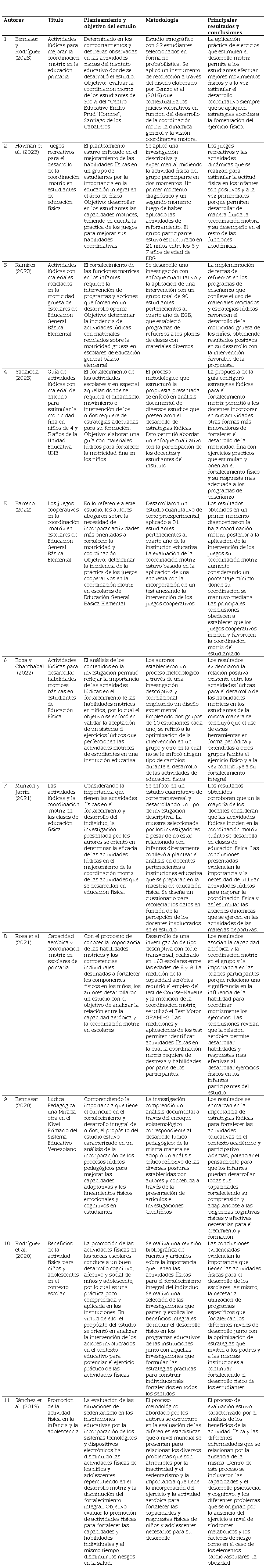 Por otra parte, la presentación de los resultados se describe en la tabla 1 ordenando la información en forma ascendente correspondiente a los años de publicación, comprendiendo la identificación general de los parámetros que formula cada uno de los artículos e investigaciones seleccionadas y sus componentes esenciales. En este sentido, se manifiestan los aspectos que puntualizan las variables planteadas y la determinación de la relación entre las actividades lúdicas y la coordinación motriz en estudiantes.