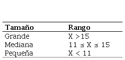A continuación, las empresas fueron clasificadas dependiendo del tamaño en: grandes, medianas y pequeñas, para la cual se ha aplicado la ecuación [1]; según los activos totales de la empresa aplicando la función Logaritmo Natural, la cual es un indicador frecuentemente utilizado como aproximación del tamaño de una entidad, los valores referenciales para la clasificación están provistos en la tabla 1.