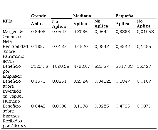 Los hallazgos de la investigación proporcionan una visión clara y concluyente sobre la aplicación de Ingeniería de Software Empírica en Empresas de Desarrollo de Software. Por un lado, se identifica que los indicadores de desempeño que mejor resultado ofrecen para las empresas son: Beneficio por Empleado (3924,74) en empresas grandes, (4798,67) en empresas medianas y (5399,30) en empresas pequeñas, Margen de Ganancia Neta (0,4364) en empresas grandes, (0,3066) en empresas medianas y (0,8787) en empresas pequeñas y Rentabilidad sobre Patrimonio (ROE) (0,2555) en empresas grandes, (0,4520) en empresas medianas y (1,11) en empresas pequeñas.