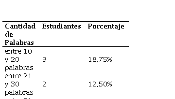 La comprensión de la cantidad de palabras después la lectura de la fábula se puede ver en la Figura 2. Como se puede apreciar de las 130 palabras de la fábula, 9 estudiantes para un 56,25% han entendido más del 50 pero menos de 80, el resto de los encuestados han entendido menos de 43, dejando en evidencia la fatal de conocimiento y adquisición de vocabulario, esto puede influir para que el texto de una lectura no sea comprendido.
