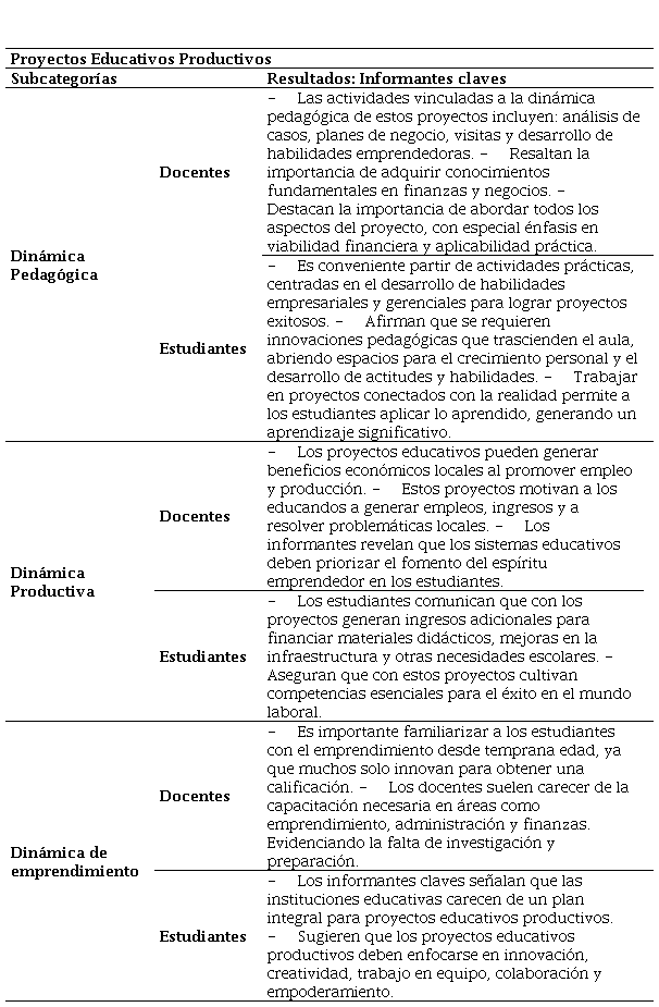 Según los informantes claves, la categoría de proyectos educativos productivos se divide en tres dinámicas complementarias: pedagógica, productiva y de emprendimiento. En la dinámica pedagógica, se busca el desarrollo de competencias a través de un aprendizaje significativo que combina lo afectivo y lo cognitivo, fomentando el trabajo cooperativo y la investigación. Los proyectos permiten a los estudiantes unir conocimientos teóricos con experiencias prácticas, mejorando su rendimiento académico (Vila Estrada, 2018).