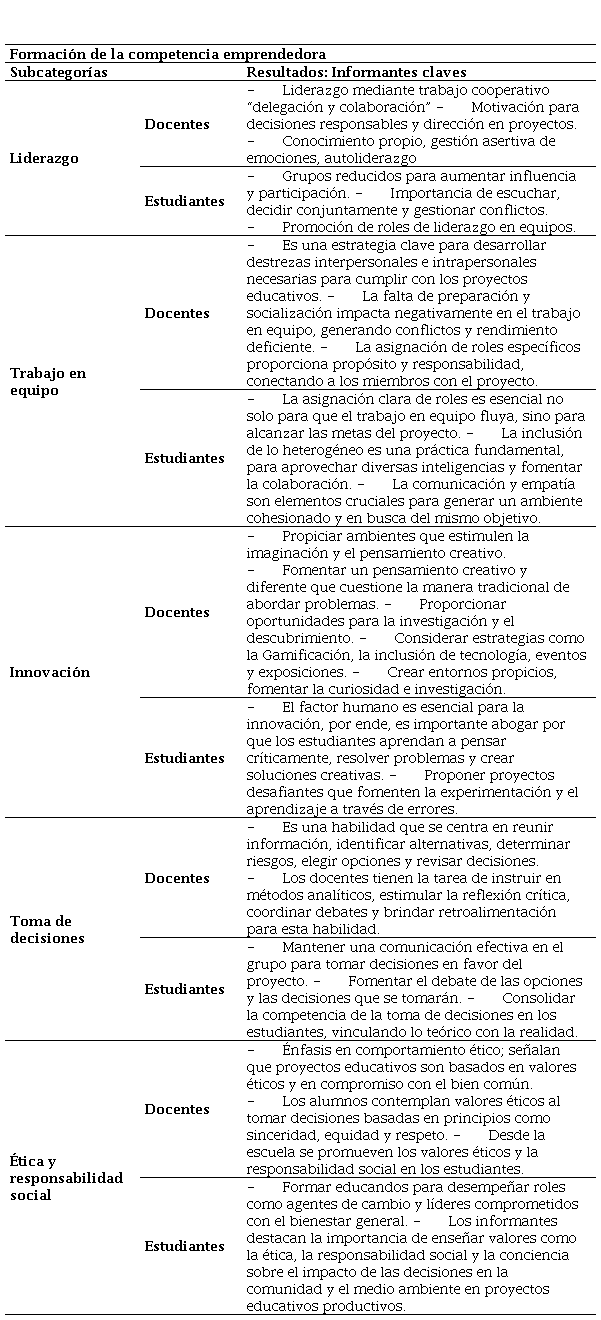 En el caso de la formación de la competencia emprendedora, se destacan las subcategorías: liderazgo, trabajo en equipo, innovación, toma de decisiones; y, ética y responsabilidad social. En cuanto al liderazgo, los informantes manifiestan que se ha observado un proceso de delegación a los estudiantes y colaboración, promoviendo el compromiso con el proyecto. El liderazgo es parte de la competencia emprendedora y es necesario tener en cuenta la opinión de Sopó et al. (2017) sobre el dominio de habilidades para ejercer influencia.