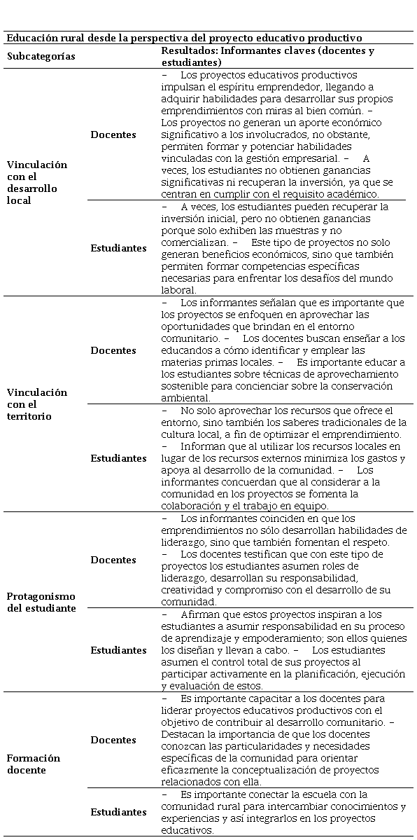 En primer lugar, la vinculación con el desarrollo local y con el territorio, en este los informantes señalan que el proceso implica la creación de unidades económicas para la producción de bienes y servicios, lo que puede generar empleo. De acuerdo con Torres y Herrera (2022) afirman que es crucial involucrar a los estudiantes en el proceso de enseñanza-aprendizaje para fortalecer la conexión de la educación rural con el desarrollo local, al relacionar sus intereses se logra alcanzar metas colectivas. Además, Rodríguez-Rodríguez (2020) destaca que debe haber una relación entre la práctica pedagógica y las ventajas territoriales. Es decir que, los proyectos educativos productivos en entornos rurales están ligados al territorio y aprovechar los recursos naturales disponibles como tierras fértiles, recursos hídricos y biodiversidad.