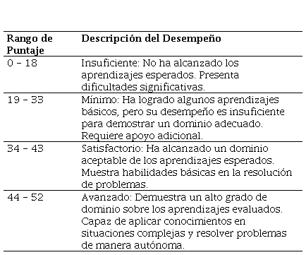 Para medir las diferencias entre los grupos, se realizó la sumatoria de los puntajes obtenidos por cada estudiante, tanto a nivel general como por categoría, calculando luego los promedios para determinar el nivel de desempeño en la competencia de resolución de problemas antes y después de la intervención. Los niveles de desempeño se definieron de acuerdo con los rangos establecidos para el instrumento evaluativo (Tabla 2).