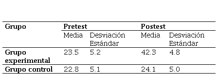 El análisis de los resultados muestra una mejora en el desempeño del grupo experimental en comparación con el grupo control. En la Tabla 3 se presentan los valores promedio y las desviaciones estándar de los puntajes obtenidos en el pretest y el postest.