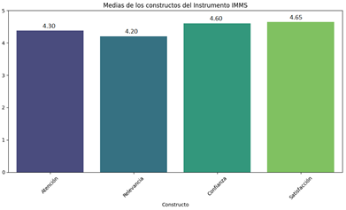 La figura 1 presenta las medias de los constructos del Instrumento IMMS, destacando la efectividad de los materiales en la motivación estudiantil. Las altas puntuaciones en atención (4.3) y confianza (4.5) indican que los recursos captaron el interés de los estudiantes y generaron seguridad en su uso. La satisfacción (4.65) refleja una percepción positiva generalizada hacia las actividades. No obstante, el constructo de relevancia (4.25), aunque alto, fue ligeramente inferior a los demás, lo que sugiere que algunos estudiantes no percibieron una conexión explícita entre las actividades y sus necesidades académicas inmediatas o aplicaciones prácticas en programación estructurada. Esta diferencia puede deberse a la ausencia de un contexto en algunos ejercicios relacionados con situaciones reales o a diferencias en la experiencia previa con el tema.