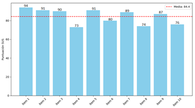 La figura 2 presenta el análisis del alfa de Cronbach para el cuestionario SUS, mostrando una alta consistencia interna con un coeficiente global de 0.84. Este resultado valida la fiabilidad de las percepciones de usabilidad de los estudiantes sobre los materiales interactivos creados con H5P. Las altas puntuaciones en ítems como facilidad de uso y confianza, junto con las bajas puntuaciones en desorganización e inconsistencia, indican que los estudiantes encontraron los materiales accesibles y bien integrados.