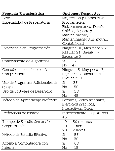La tabla 1 presenta el perfil de los estudiantes y sus preferencias de aprendizaje, obtenidas mediante un cuestionario inicial aplicado para diseñar materiales interactivos con H5P. La muestra incluyó 38 mujeres y 45 hombres de diversas especialidades, con la mayoría reportando poca o ninguna experiencia en programación. Las preferencias de aprendizaje variaron, destacando lecturas, videotutoriales y ejercicios prácticos. La mayoría tenía acceso a computadoras con internet, y preferían estudiar en grupos.