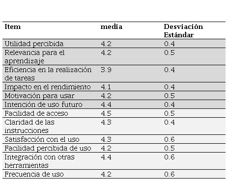 Para evaluar la fiabilidad, se utilizó el coeficiente alfa de Cronbach (Cronbach, 1951). En el Technology Acceptance Model (TAM), los constructos de Utilidad Percibida (UP) y Facilidad de Uso Percibida (FUP) obtuvieron valores alfa de 0.78 y 0.85, respectivamente. En el Instructional Materials Motivation Survey (IMMS), los constructos de Atención, Relevancia, Confianza y Satisfacción mostraron valores alfa de 0.82, 0.75, 0.84 y 0.80. El System Usability Scale (SUS) presentó un valor alfa de 0.84 para la Usabilidad General. Según criterios aceptados, valores mayores a 0.7 son aceptables, mayores a 0.8 son buenos y mayores a 0.9 son excelentes (Barreto y Perea-Serna, 2023). Los instrumentos mostraron una fiabilidad buena (TAM) y aceptable (IMMS y SUS), sin ítems redundantes.