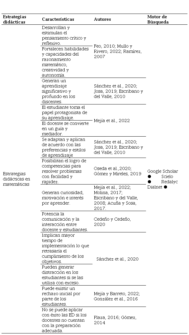 Se concluye que las estrategias didácticas en el proceso de enseñanza aprendizaje de matemáticas se caracterizan por desarrollar y estimular el pensamiento crítico y reflexivo; fortalecer habilidades y capacidades del razonamiento matemático, creatividad y autonomía; generar un aprendizaje significativo y profundo, así como, la curiosidad, motivación e interés por aprender; enriquecer su formación integral fomentando valores, destrezas y capacidades; y, potenciar la comunicación y la interacción entre docente y estudiantes.