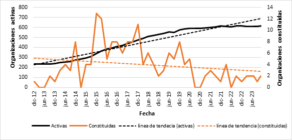 Para analizar las tendencias en la evolución de las EPS, se utilizaron líneas de regresión generadas en Microsoft Excel 2016. Estas líneas permitieron identificar patrones de crecimiento y declive en el número de organizaciones activas y constituidas a lo largo del período 2012-2023. Este método cuantitativo es apropiado para determinar la dirección y el ritmo de las variaciones observadas. El análisis visual de los datos se realizó mediante la construcción de gráficos de dispersión, histogramas y diagramas de sectores.