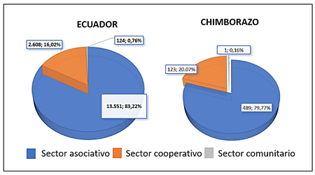 En cuanto a la clasificación sectorial de las organizaciones EPS, la Superintendencia identifica tres sectores principales: asociativo, cooperativo y comunitario. Los resultados presentados en la figura 4 destacan una predominancia significativa del sector asociativo en Chimborazo, donde el 79,77% de las organizaciones pertenece a esta categoría, cifra alineada con el patrón nacional (83,22%). Este predominio puede explicarse por la flexibilidad y la estructura democrática inherentes a las organizaciones asociativas, características que las hacen particularmente atractivas en comunidades con recursos limitados. Además, estas suelen ser más accesibles en términos de formación y funcionamiento, lo que reduce las barreras de entrada para grupos vulnerables.