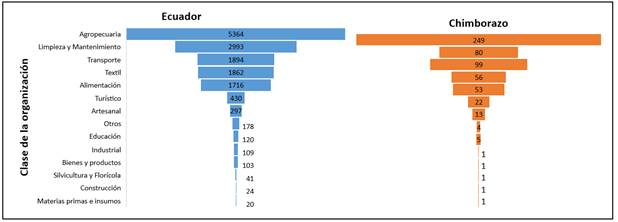 En cuanto a las actividades, el predominio de las organizaciones agropecuarias confirma la relevancia histórica y económica de la agricultura en Chimborazo (Castro-Albán et al., 2023). Este sector, aunque central para la economía rural, plantea riesgos debido a su alta vulnerabilidad a las fluctuaciones del mercado y las condiciones climáticas adversas. Por otro lado, la participación de actividades como transporte y limpieza y mantenimiento refleja una diversificación parcial que podría fortalecerse con mayores incentivos y capacitación técnica. La baja representación de sectores como la industria y los servicios especializados resalta oportunidades de crecimiento en áreas con mayor potencial económico y de empleo, (Morales Molina & Llamuca Pérez, 2021).
