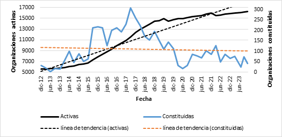 Los resultados sobre el número de organizaciones activas y constituidas, como se muestran en las figuras 1 y 2, revelan que las líneas de tendencia en Chimborazo siguen un patrón similar al nacional, con un incremento del 164,1% entre 2012 y 2023. Este crecimiento, aunque significativo, es ligeramente inferior al aumento nacional del 191%, lo que podría estar relacionado con factores estructurales específicos de la provincia, como su elevada tasa de pobreza (31,5%) y desigualdad territorial, que limitan la capacidad de estas organizaciones para expandirse. La participación de Chimborazo en el total nacional, que asciende al 3,79%, destaca el papel de esta provincia como un contribuyente modesto al panorama nacional de las organizaciones EPS.