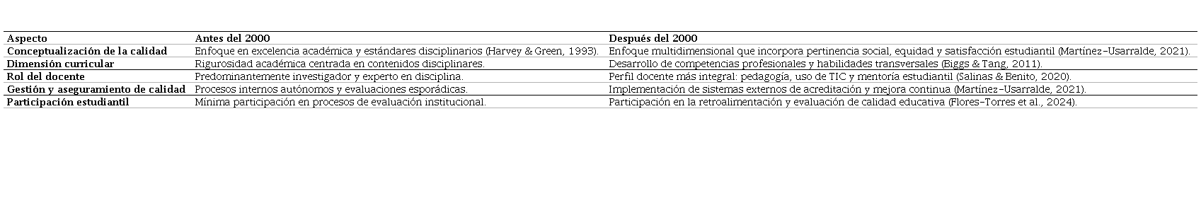 En la Tabla 2 se presenta la comparación de las dimensiones y componentes de la calidad en la educación superior antes y después del año 2000. Mientras que, antes de esa fecha, predominaba una visión centrada en la excelencia académica, el prestigio institucional y el cumplimiento de estándares disciplinarios, en el contexto posterior se ha adoptado un enfoque más amplio y multidimensional, que incorpora aspectos como la pertinencia social, la equidad y la satisfacción estudiantil. Asimismo, la evolución del plan de estudios pasó de estar orientada exclusivamente a la transmisión de contenidos a fundamentarse en el desarrollo de competencias.