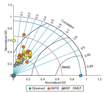 The ANFIS model was found to have the best performance for the eight-month in advance predictions, whereas the M5P model performed better for 10-month in advance predictions and the MLP network for one-month in advance. Error parameters (Table I) indicated that the MLP network performance was a little better than the other two models, while Dastorani et al. (2010) showed that the potential of ANNs with the ANFIS model is almost the same in predicting dry land precipitation. The Levenberg-Marquardt training algorithm (used in the MLP network) is more powerful and faster than the standard back-propagation algorithm (used in ANFIS) (Abyaneh et al., 2011). This may be the reason for the better efficiency of the MLP model compared to ANFIS. Also, we used the Taylor diagram (Fig. 2) to investigate the accuracy of the models. It is clear that MLP has a better aptitude in comparison with the M5P model tree and ANFIS.