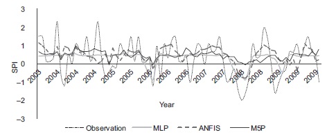 In this paper, we used a Taylor (2001) diagram (Fig. 2) to evaluate the accuracy of ANFIS, MLP, and the M5P model tree. This diagram provides a visual framework for comparing different model results to a reference model or, mainly, to observations. The Taylor diagram is drawn by standard deviation (STD), centered root mean square error (RMSE) and correlation (COR) between different models and observations. Statistics of STD, RMSE and COR were computed for ANFIS, the M5P model tree and MLP from one to 12 months in advance (Fig. 2). The position of each model in the plot shows how closely the simulated SPI pattern matches with observations. From Fig. 2 it can be seen that predictions of ANFIS and MLP are in agreement with observations, unlike the M5P model tree. Although predictions in ANFIS and MLP are quite similar, some step predictions in MLP are closer to observations (e.g., one-month-in-advance predictions). Standard deviation of prediction data indicated that none of the models was able to predict fluctuations in observation data. Figure 3 compares the observed and predicted SPI for the testing set in a one-month lag time.