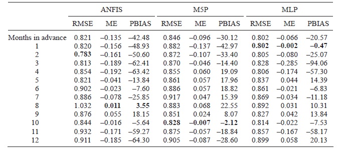 Table I shows the performance of the ANFIS, M5P and MLP models in predicting SPI time series 12 months in advance. Regarding data testing, the best performance of ANFIS was found for eight-months in advance prediction, with RMSE, ME and PBIAS values of 1.032, 0.011, and 3.55, respectively (Table I). For the M5P model tree, the minimum values of RMSE, ME and PBIAS are related to 10-months in advance predictions (RMSE = 0.828, ME = –0.007, and PBIAS = –2.12). For MLP, the best performance of prediction was obtained one step ahead compared to other models (RMSE = 0.802, ME = –0.002, and PBIAS = –0.47) (Table I). PBIAS indicated that predictions are mostly overestimated (about 85, 54 and 70% for ANFIS, M5P model tree and MLP, respectively).