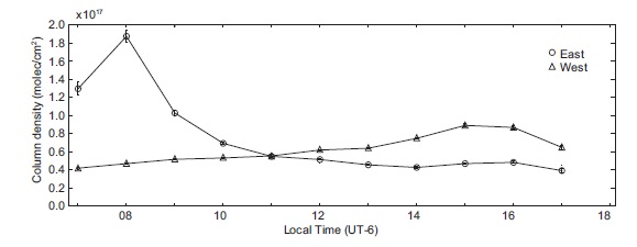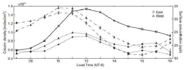 The average diurnal cycle of formaldehyde slant columns measured towards the east at a zenith angle of 70º (circles) and towards the west at –70º (triangles) from the UNAM station is presented in Figure 7. A large difference between the two observation directions is observed. In the mornings, a strong HCHO peak can be detected towards the east which is not seen when pointing west. This peak at 8:00 LT is consistent to what was measured by Grutter et al. (2005) in downtown Mexico City, where maxima of near surface concentrations were reported to occur during the early morning.