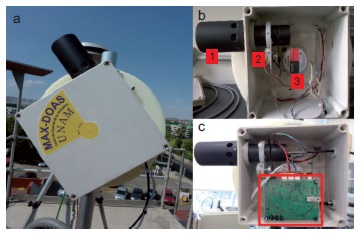 The telescope is fixed and introduced into an enclosure (NEMA-rated type 3), so that only 10 mm of the telescope is out of the box. A 50.8 mm × 100 mm PVC pipe, painted in black, is placed around the telescope to keep it under shadow and for protection (fig. 1a). The scanner enclosure (200 × 200 × 120 mm) is resistant to sunlight, hermetically sealed to protect the inner parts from external conditions like rain, wind and bugs, and uses gland connectors for the cables (optical fiber and communication cable). These factors are important when operating the instruments during long periods and in harsh weather conditions (e.g. Hönninger et al ., 2004b; Carlson et al. , 2010; Galle et al. , 2010).