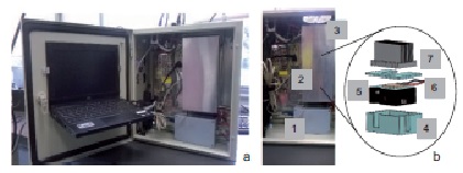 The acquisition and control unit is a resistant metallic housing (400 × 400 × 200 mm) which is typically installed indoors on the wall not too far from the scanner. It receives the light collected by the scanner, sends it to the spectrometer, controls and reads the motors and sensors, and records the information in a computer.