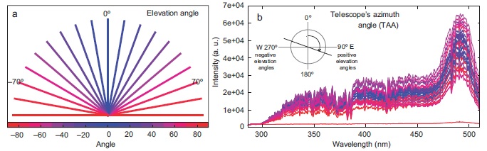 In each cycle 36 spectra are recorded at different elevation angles, as well as one reference spectrum and one dark spectrum, taking less than 5 min to be completed. Although the duration of each cycle can vary, an average of 150 cycles is recorded per day. Figure 3 shows a drawing of (a) the elevation angles and (b) an example of the measured spectra within a sequence. The integration time is adjusted for each cycle by the intensity in the reference spectrum. It is also shown in the figure how the orientation of the scanner is defined by an azimuth angle with respect to the north.