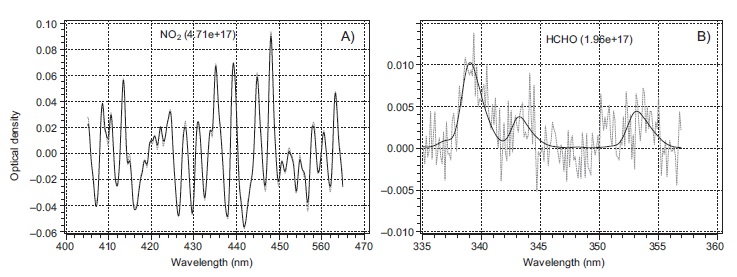 The high resolution spectra were convolved with a slit function of the spectrometer measured with a low pressure Hg lamp. Typical retrieval fits are shown in Figure 5. For this example, the retrieved NO2 SCD was 4.71 × 1017 molecules/cm2 with a fitting error of 2.43 × 1015. For HCHO, the retrieved SCD was 1.96 × 1017 molec/cm2 with an error of 2.31 × 1016. The corresponding residuals were of the order of 10–3 RMS, as expected for compact DOAS systems.