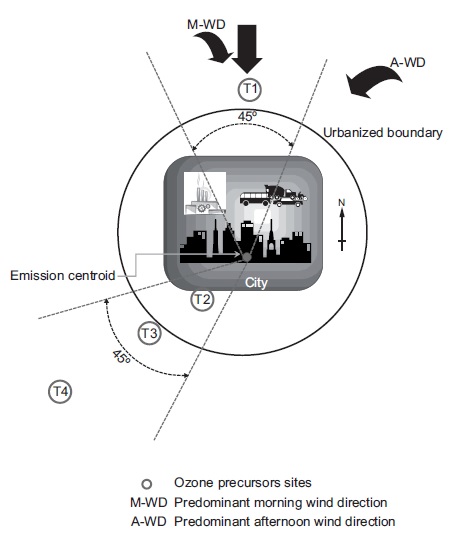 The US-EPA recommends delineating the upwind and downwind sectors of the study area in order to select proper site locations. It was found during the period of March to June, when the highest ozone concentration levels are recorded, that the prevailing wind is northwesterly in the morning hours and northerly in the evening hours. These wind patterns control the temporal patterns of ozone distribution and those of its precursors.