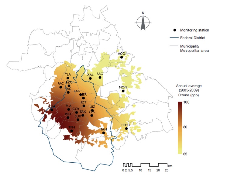 • Information from the 2000 Censo Nacional de Población (National Population Census) and projections of the 2009 database form de Consejo Nacional de Población (National Population Council, CONAPO) for statistics comprised in the area of study were used. Population densities were calculated at the proposed monitoring-station sites (CONAPO, 2009).