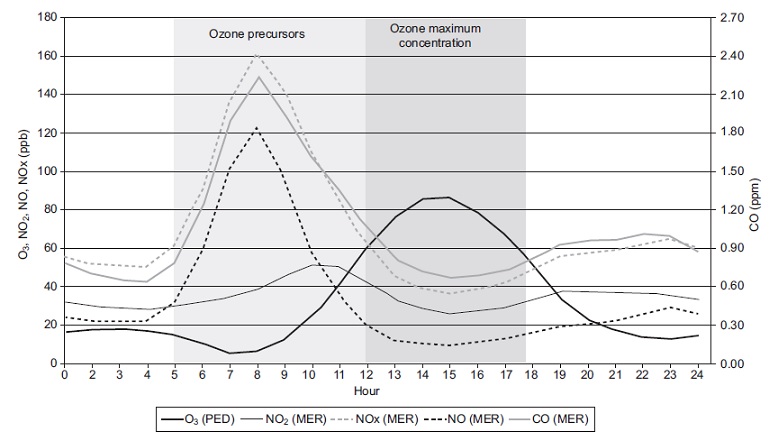 Based on this information and on the trends of pollutant levels in Mexico City (SMA-GDF 2012), the need for installing an ozone precursor network to understand the development of this pollutant was confirmed. Information from the ozone precursors network is important for present and future studies directed to reduce ozone concentrations in the MCMA. The maximum concentrations of ozone are usually recorded during the hottest months, which are from March to June. This time of the year is characterized by clear skies, greater solar radiation, low humidity and high temperatures.