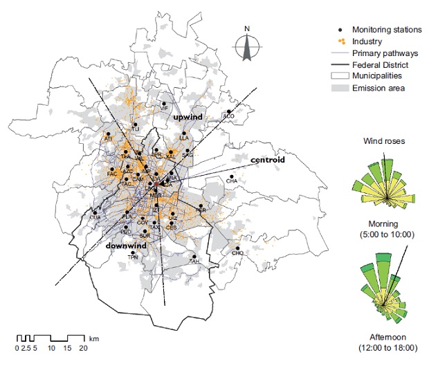 Based on this centroid location, the area of study was sectorized as follows: (a) the upwind zone, based on the prevailing morning winds, extends north from the centroid and contains the industrial zone in the northwestern part of the city and the major roads that connect to Mexico City the adjoining State of Mexico municipalities; (b) the downwind zone extends southwest from the centroid due to the prevailing evening winds; the highest ozone concentrations are regularly recorded in this area (Fig. 4).