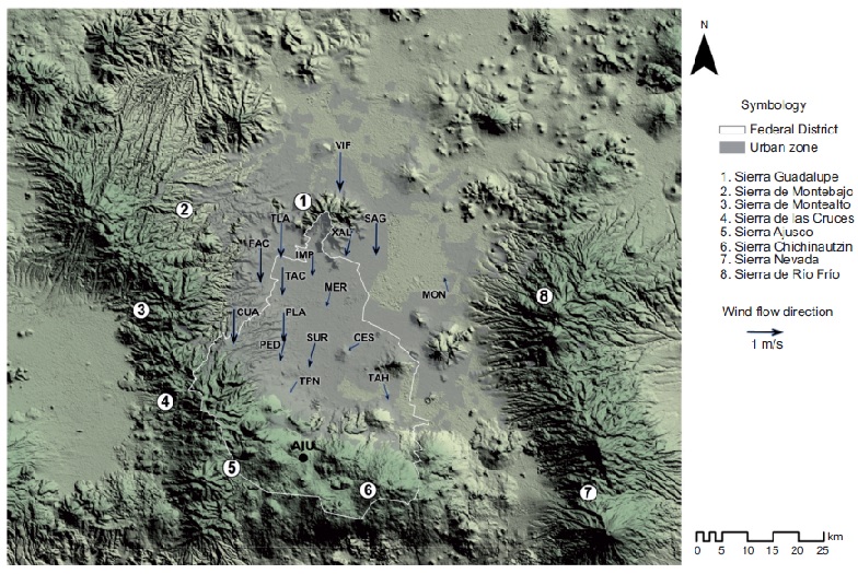 • Physiographic characteristics of the MCMA were obtained from the Instituto Nacional de Estadística y Geografía (National Institute of Statistics and Geography, INEGI). The main mountain ranges and ridges surrounding the area of study were identified, and this information was used to evaluate the airflow and the pollutant dispersion patterns (INEGI, 2005).