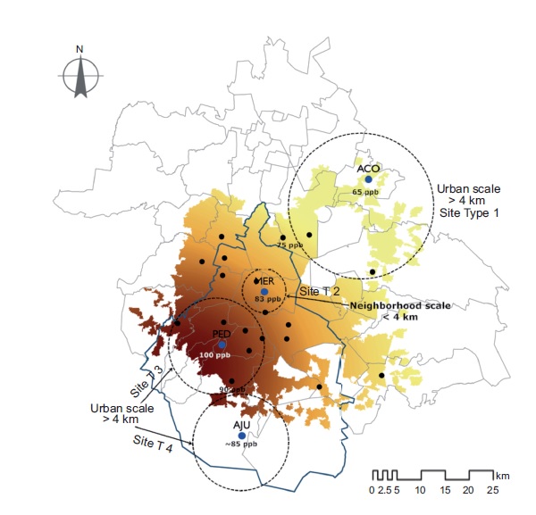 Another important criterion in the selection of sites is that distances between sites are in accordance with the scales of representativeness, in order to obtain a representative sample of the area’s precursor emissions and avoid redundancy (US-EPA, 1994). To that end, the annual average maximum daily ozone concentrations during the period 2005-2009 were interpolated between the selected sites. It is important to mention that the values of the AJU station were calculated by interpolation using the Kriging method, since this station lacks equipment to determine ozone concentrations. The areas of spatial representativeness for each type of site were mapped in the GIS environment, and the overlaps between sites were evaluated. The results indicate that none of the four selected sites is redundant, and the four sites are located at the recommended distances between sites, as shown in Figure 6.