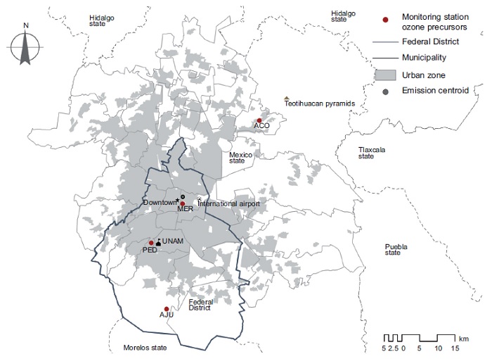 • Data regarding the distribution of emission sources and precursor emissions (NOx and VOC) was obtained from the 2008 MCMA emissions inventory. This inventory contains information regarding stationary, area, mobile and biogenic sources, for 1-km2 cells in units of tons/year (SMA-GDF, 2010b).