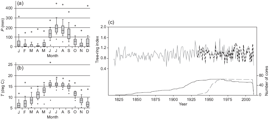 The influence of climate on growth ring chronologies for different age classes of P. cooperi was assessed by the Pearson’s correlation coefficient analysis (Blasing et al., 1984). We investigated the correlation coefficient with DENDROCLIM2002 software (Biondi and Waikul, 2004), which applies the statistical significance of Pearson’s correlation coefficients by calculating a 95% interval based on 1000 bootstrapped resamples of the data. Correlation coefficients were calculated for each age class using residual chronologies.