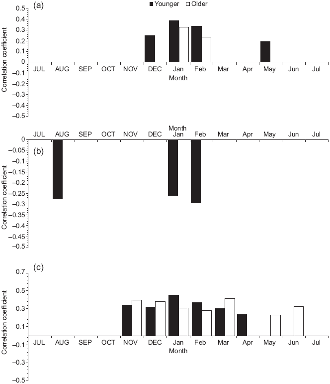 When comparing the chronologies of the two age classes with Tmin , younger trees had a positive and significant response ( p < 0.05) in the months of December, January and February of the current growth period, and only the months of January and February were significant for older trees (Fig. 3a). In the case of Tmax , younger trees have a negative and significant relationship ( p < 0.05) in August to the previous growth period and in January and February to the current growth period. Meanwhile, older trees showed no significant relationship ( p < 0.05) (Fig. 3b). When comparing the chronologies with total monthly precipitation, both age classes had a significant and positive response ( p < 0.05) from November to March, with no observed differences between age classes (Fig. 3c).