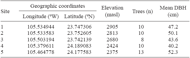 Mexico has more native pine species than any other country worldwide (Farjon, 2010), and the ecological and economic importance of these species has received global recognition (Silva et al., 2014). The forests of the Sierra Madre Occidental are characterized by an abundance of Pinus spp., with P. cooperi as the dominant species having great ecological importance (Cruz-Cobos et al., 2008). Further, the potential dendrochronological amplitude of this species provides a good opportunity to evaluate how climatic drivers constrain tree growth (Pompa-García et al., 2015).