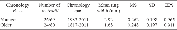 Table II shows the dendrochronological statistics calculated for the residual chronologies for each age class of P. cooperi . The extension of the timeline for the younger class is 1933-2011 and 1817-2011 for the older class (Fig. 1). The mean tree ring width and mean sensitivity for the younger class are 2.92 mm and 0.262, respectively; for the older class they are 1.68 mm and 0.248, respectively (Table II).