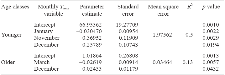 We observed significant and positive differences between age classes in the April precipitation for younger trees and significant differences in May and June for older trees. The linear regression indicated that TRI was significantly associated with climatic variables. Table III shows details of the Tmax monthly analysis for different age classes. For TRI, most of the variables selected for the models were those from the previous winter. Previous winter Tmax ( PWTmax ) (i.e., from previous November to the current January) was mainly associated with TRI ( p < 0.1, e.g. the model has statistically significant predictive capability in the regression) for both age classes. However, the stepwise regression found that PWTmax is more related to the younger class than to the older class. Models applied to older and younger classes sites explained 13 and 50% of the total variance of TRI, respectively. The PWTmax parameters estimates obtained for younger trees with multivariate models indicated that this variable had a greater association with radial growth in this class.