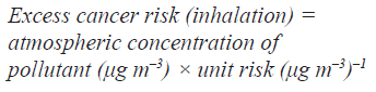 Excess cancer risks (ECRs) were calculated using the unit risk and the PM-bound concentration of the metals, which can be used to represent their total concentration (Park et al., 2008). The information of carcinogenic types and unit risks of the metals is available from the US-EPA database for IRIS (Integrated Risk Information System). We assumed that a breathing rate for 8-h occupational exposure = 10 m3, and a breathing rate for 24-h continuous exposure = 20 m3 (occupational exposure = 5 days/week; continuous exposure = 7 days/week) (US-EPA, 1998). The typical method for calculating ECRs is by using the following formula (US-EPA, 1998):