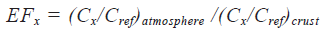 Enrichment factors (EFs) were calculated to determine whether the PM originated from crustal or non-crustal sources. They were estimated for individual elements over the average elemental composition of the upper continental crust (Hernandez et al., 2003). Typically, the EF method normalizes the measured heavy metal content with respect to a sample reference metal such as Fe or Al (Ravichandran et al., 1995). The EFs of an atmospheric element were calculated using the following equation: