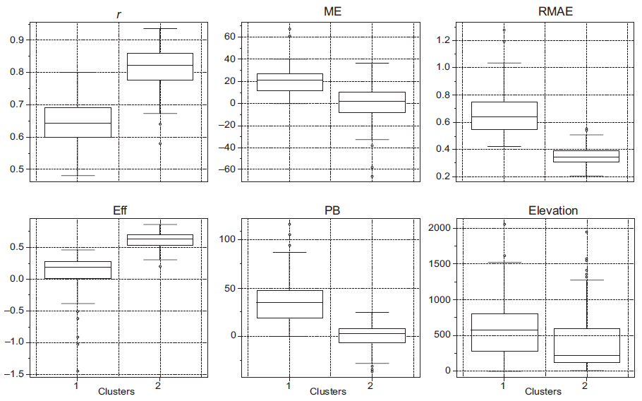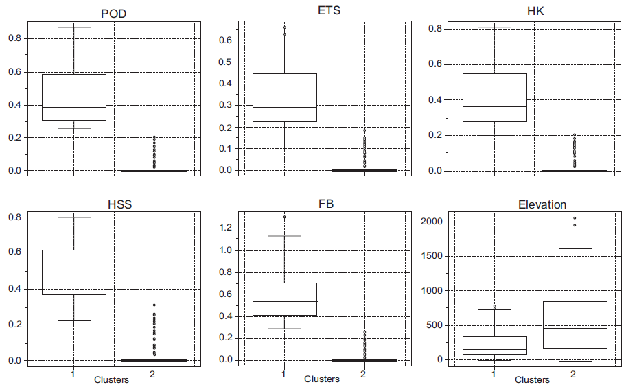 In order to examine spatial patterns in the performance of CHIRPS-derived rainfall estimates, the performance metrics from each rain gauge shown in Table I were partitioned into numerical and categorical metrics. Next, a cluster analysis was applied to both matrices to identify homogeneous stations according to the similarity of performance metrics. Two clusters were identified for both groups. For comparison purposes, the numerical and categorical performance metrics for each cluster were assessed through boxplots.