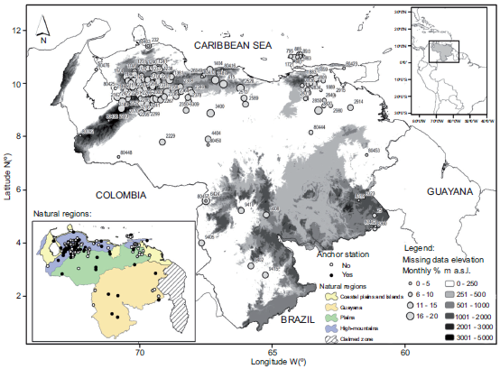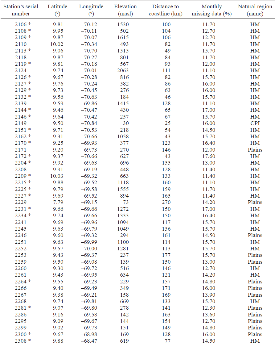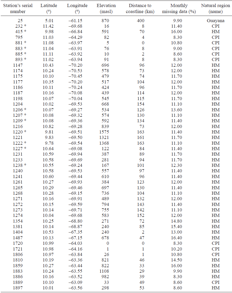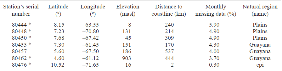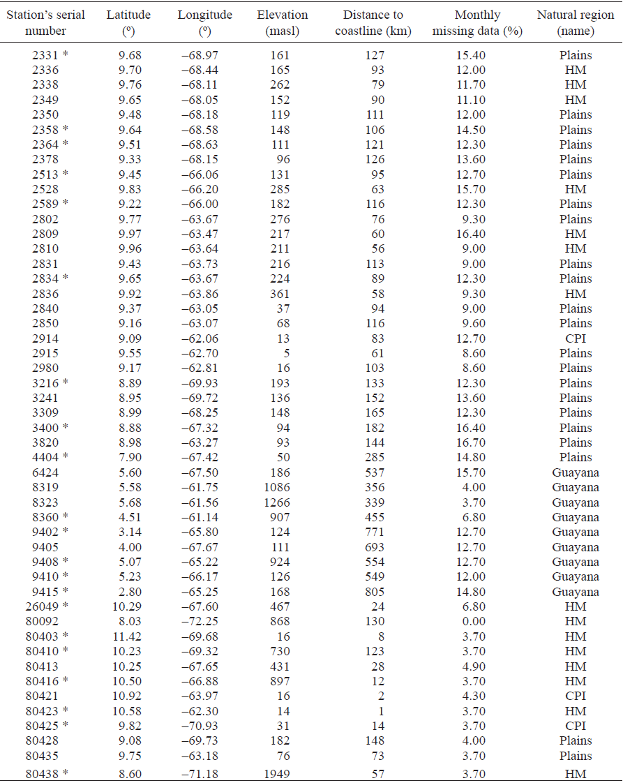 The percentage of missing data per station and month varied between 0 and 17.60% with an average of 11.44%. The mean distance to the coastline is 134 km, and stations are located, on average, at an elevation of 478 masl. Table I lists the natural region where each station is located: coast plains and islands (11%), Guayana (8%), plains (25%) and high-mountains (56%). These natural regions have been defined based on the main climate and topographic features among biophysical and other factors given by the Venezuelan Ministry of Environment and Natural Resources (available online at http://tapiquen-sig. jimdo.com).