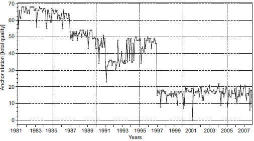 In general, the results from Table IV suggest that CHIRPS-based rainfall estimates might be useful for flood monitoring, but deficient for drought monitoring in the study area. The number of anchor stations used in the creation of CHIRPS in time could help to explain this discrepancy. For example, Figure 4 shows that for the period 1981-1987, between 48 and 68 anchor-stations were used; for the period 1988-1996, between 23 and 54 anchors-stations were used; and for the period 1997-2007, a maximum of 22 anchor-stations were used in the study area. The gradual decrease in number of ground-based observations might have affected the correction stage of the CHIRPS v.2 product, which is reflected as rainfall estimates with low-accuracy (Toté et al., 2015).