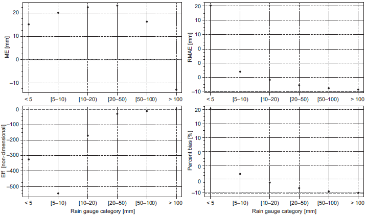 In examining the variability of the measurement performance, according to the observed rainfall amount, all metrics listed in Table IV were calculated for different rainfall categories supported by monthly rainfall observations: < 5 mm, N = 5331; [5-10) mm, N = 2,096; [10-20) mm, N = 3,389; [20-50) mm, N = 7,548; [50-100) mm, N = 9,002; and > 100 mm, N = 16,789 (N indicates the number of pair-wise cases analyzed by category). Figure 5 displays these results. On the whole, higher RMAE, lower Eff, and higher PB can be seen in this figure for low rainfall observations, situation similar and consistent with the inferences made from Figures 2 and 3. Also, it can be noted that rainfall observations less than 100 mm show negative ME values; this means a large overestimation.