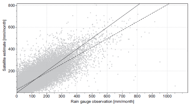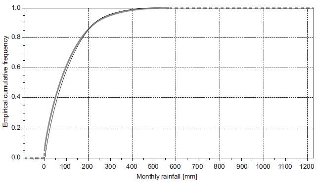 Figure 2 shows rain gauge observations and CHIRPSbased rainfall estimates at monthly scale for the period 1981-2007. Note that the CHIRPS v.2 product exhibits an overestimation of low rainfall values and an underestimation of high values. These features are also evident in their respective cumulative density plots (Fig. 3). In general, Figures 2 and 3 reveal an overestimation in the values of observed rainfall between 0 and about 200 mm/month, whereas for values outside this range the amount of rainfall tends to be underestimated by the CHIRPS v.2 product. One implication of this result is that low rainfall estimates could mask drought conditions (particularly absent rainfall), which is a feature highly unfavorable in drought-prone regions (e.g., the Caroni river hydropower reservoirs system).