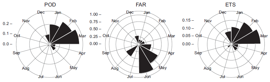 To zoom in on the performance features of the CHIRPS v.2 rainfall product, this section will focus on the numerical and categorical metrics in the seasonal context. Figure 6 provides the values of the numerical metrics by month for the period 1981- 2007. A difference between the dry and rainy season is evident. During the dry season (October-March), r is lower (mean = 0.653), RMAE is worse (mean = 0.538), and Eff is lower (mean = 0.397). In contrast, for the rainy season (April-September), most metrics perform better. In fact, the correspondence between rainfall estimates and station observations is higher (based on r, mean = 0.791), RMAE is lower (mean = 0.363), and Eff is higher (mean = 0.607).