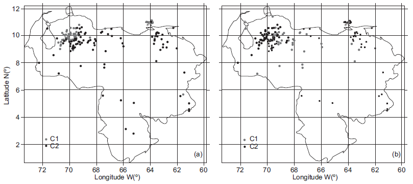 Figure 8 presents a comparison between numerical metrics, while Figure 9a displays the spatial distribution of the clustered stations. For all numerical metrics, the C1 cluster shows the worse performance. Note that the stations that belong to the C1 cluster are mainly concentrated in the northwest region of Venezuela and Margarita Island. Furthermore, most of the stations clustered in C1 are located in the leeward part of the Andes (Figs. 1 and 9a). This feature is interesting because it is well known that these mountains induce prevailing dry climate in several regions of South America (Giovannettone and Barros, 2009). In this latter region, orientation and topographic features facilitate the blocking of the east trade winds and their channeling off this region. Thus, most rainfall events are induced by an isolated convective activity (Insel et al., 2010). At the same time, unlike the rest of the country where a unimodal pattern is dominant, the rainfall regime in this region shows a bimodal pattern (Pulwarty et al., 1992). In contrast, the stations clustered in C2 are largely located in flat open areas where there is a prevalence of convective rainfall driven by the location and activity of the ITCZ and other tropical disturbances (Sanso and Guenni, 2000).